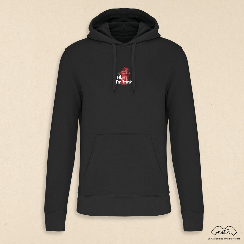 Sweat-shirt unisex BIO à capuche avec cordon, poche avant de type kangourou, imprimé en France dans nos locaux.