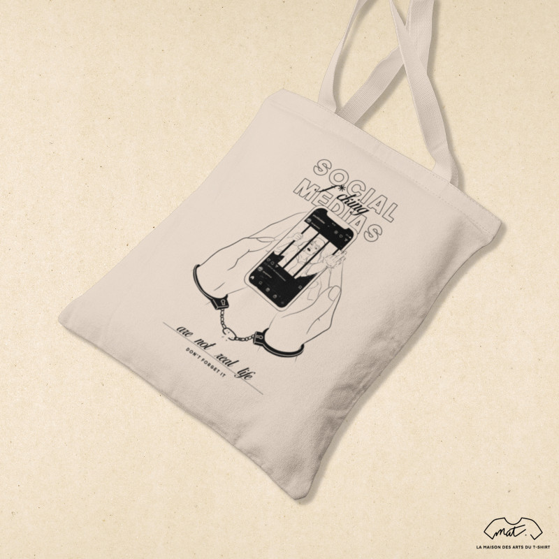 Tote bag imprimé, en tissu naturel avec longues anses.