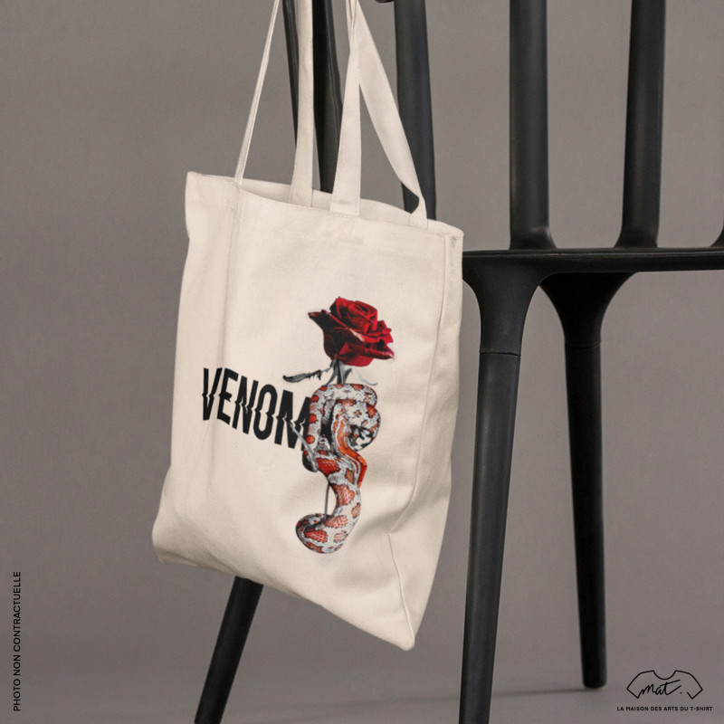Tote bag imprimé, en tissu naturel avec longues anses.