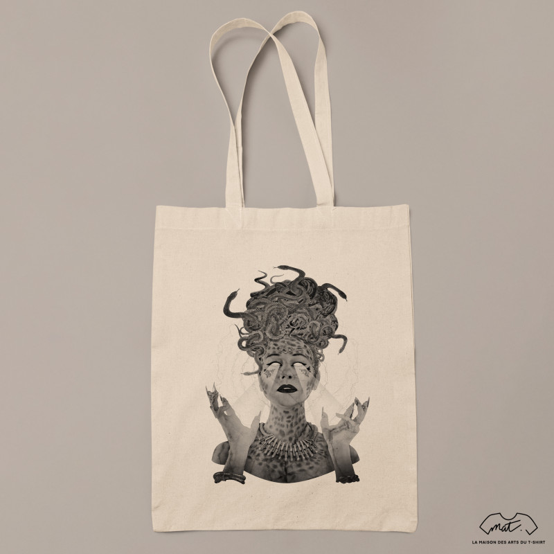 Tote bag imprimé, en tissu naturel avec longues anses.